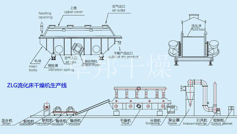 物料自進料口進入流化床內(nèi);在安裝于床體兩側(cè)上的兩臺振動電機產(chǎn)生一固定頻率的激振力作用下,物料沿水平網(wǎng)板跳躍,拋擲向前連續(xù)運動;熱風由下部向上通過網(wǎng)板,穿過物料層,經(jīng)充分的傳熱、傳質(zhì)后,由排風口排出,干燥物料由出料口排出,以達到脫水干燥之目的。